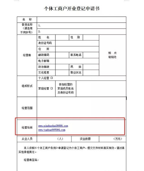 这里提醒一下,在填写《个体工商户开业登记申请书》“经营场所”一栏时,应填报电子商务平台名称和网络经营场所网址。(如上图样表)在多个电子商务平台从事经营活动的,应当填报多个网络经营场所网址。